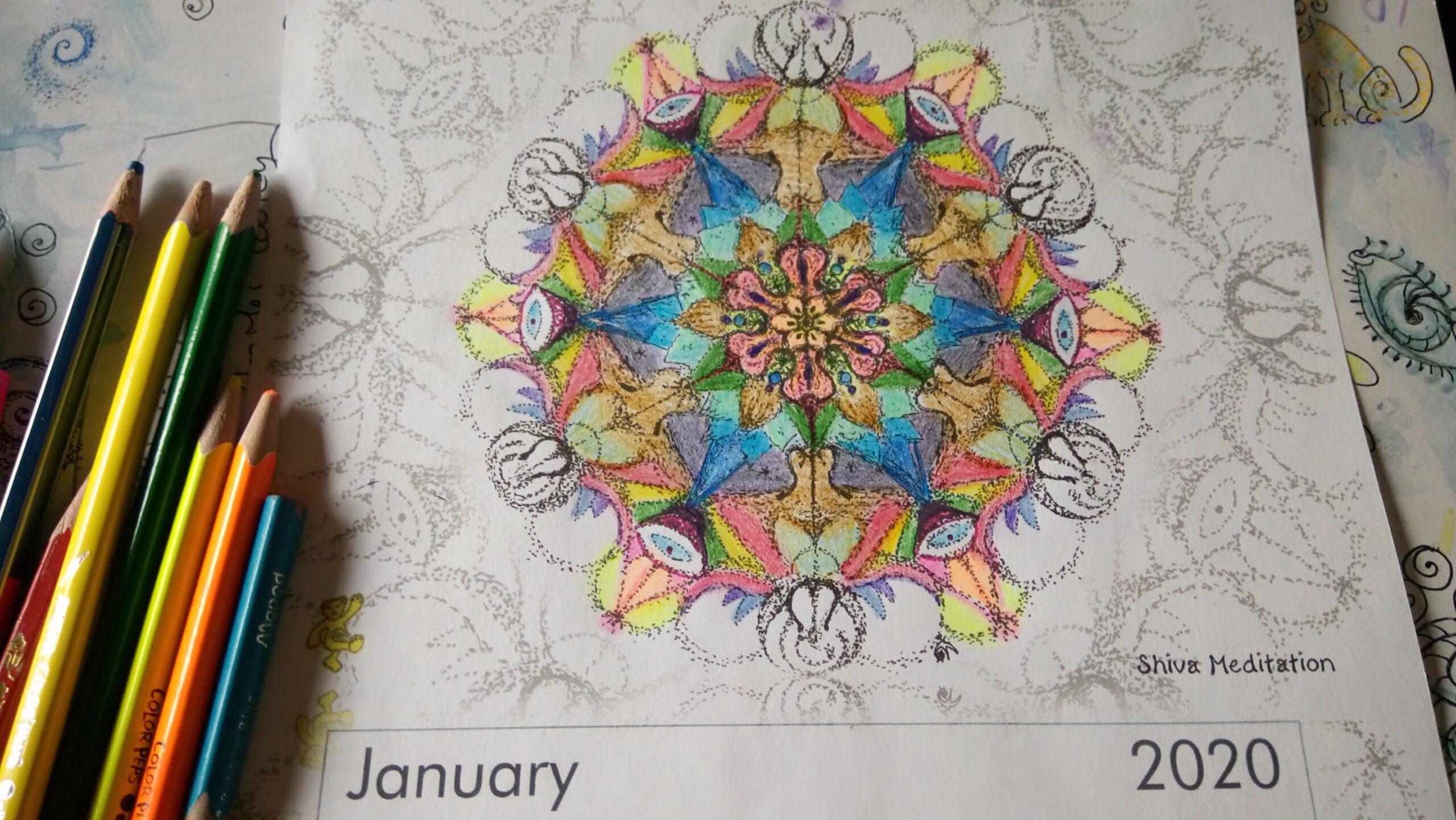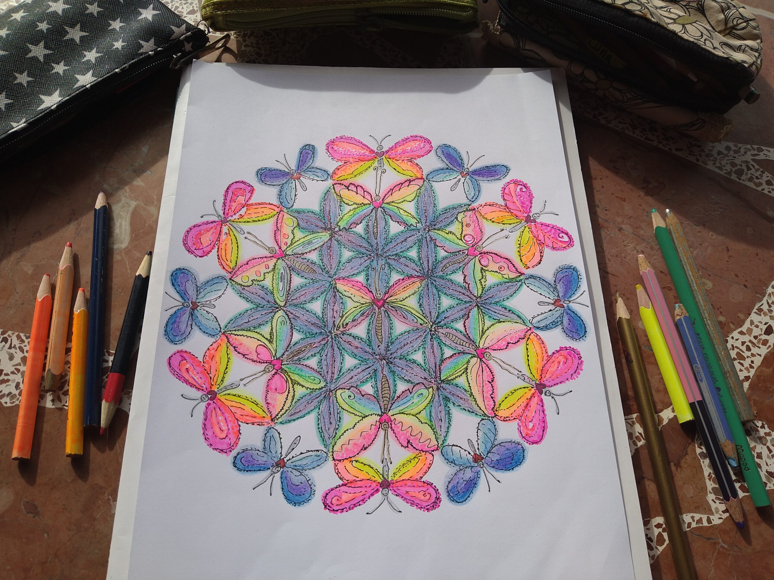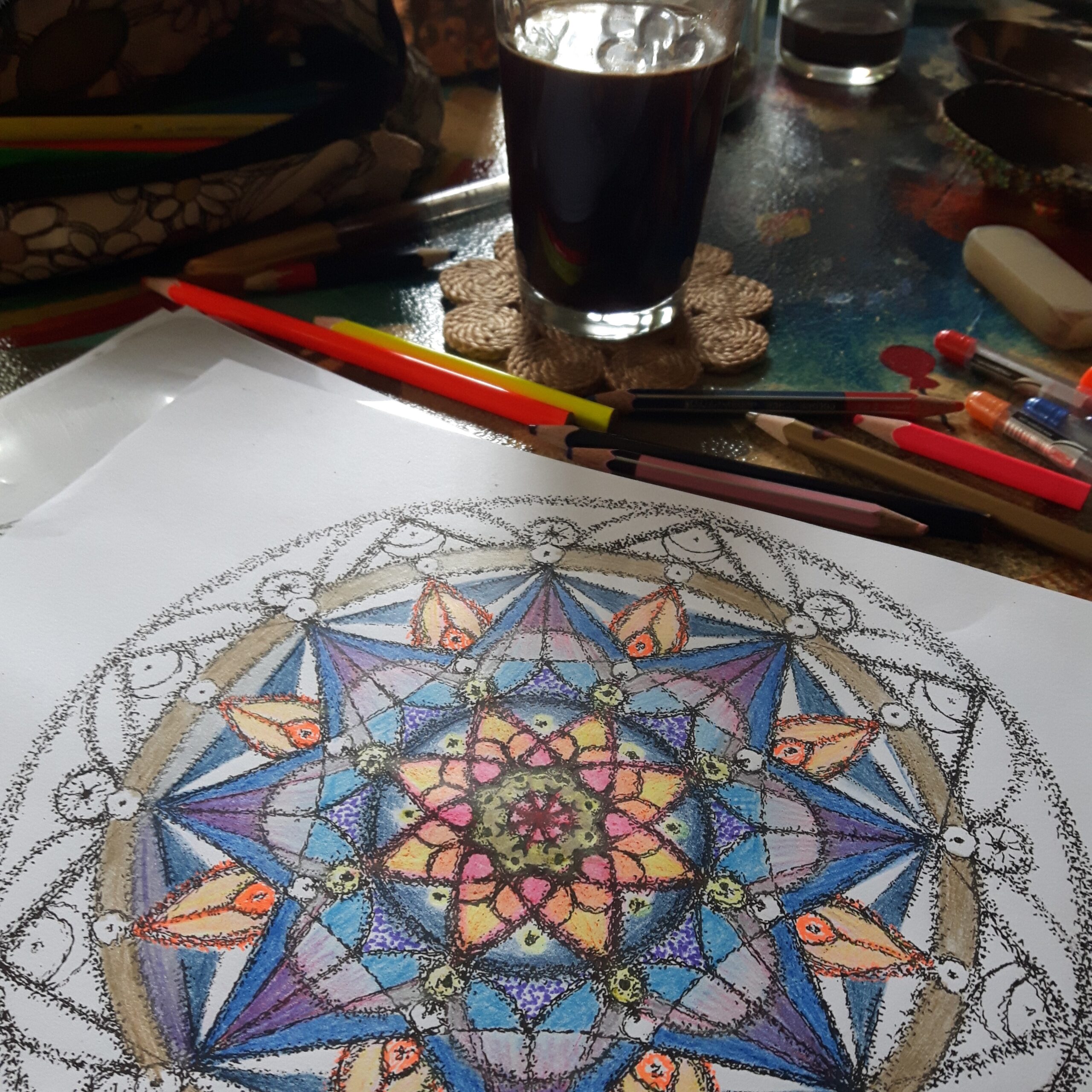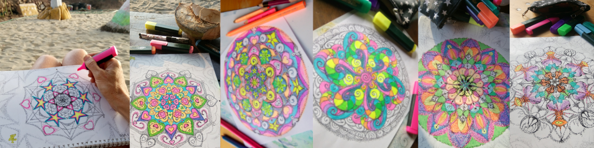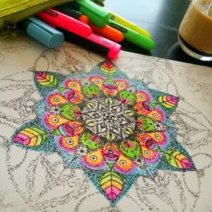 One of my favorites is to start the day (mostly after but can once in a while also be before my yoga) with coffee and colors. I love to color my mandalas any time a day, but to start with it in the morning indicates a special day in a way. That might be a Sunday or a day when i take a conscious break of the usual routine. I love to color after times of study or periods that involved a lot a mind activity and over-stimulation. When the mind becomes a constant chatter box, coloring helps to calm down and quiet the mind. I love to do some coloring when i want to be creative (what is mostly all the time) but don’t necessarily have an idea or the drive to create something new. I can be creative without the need of a specific outcome.