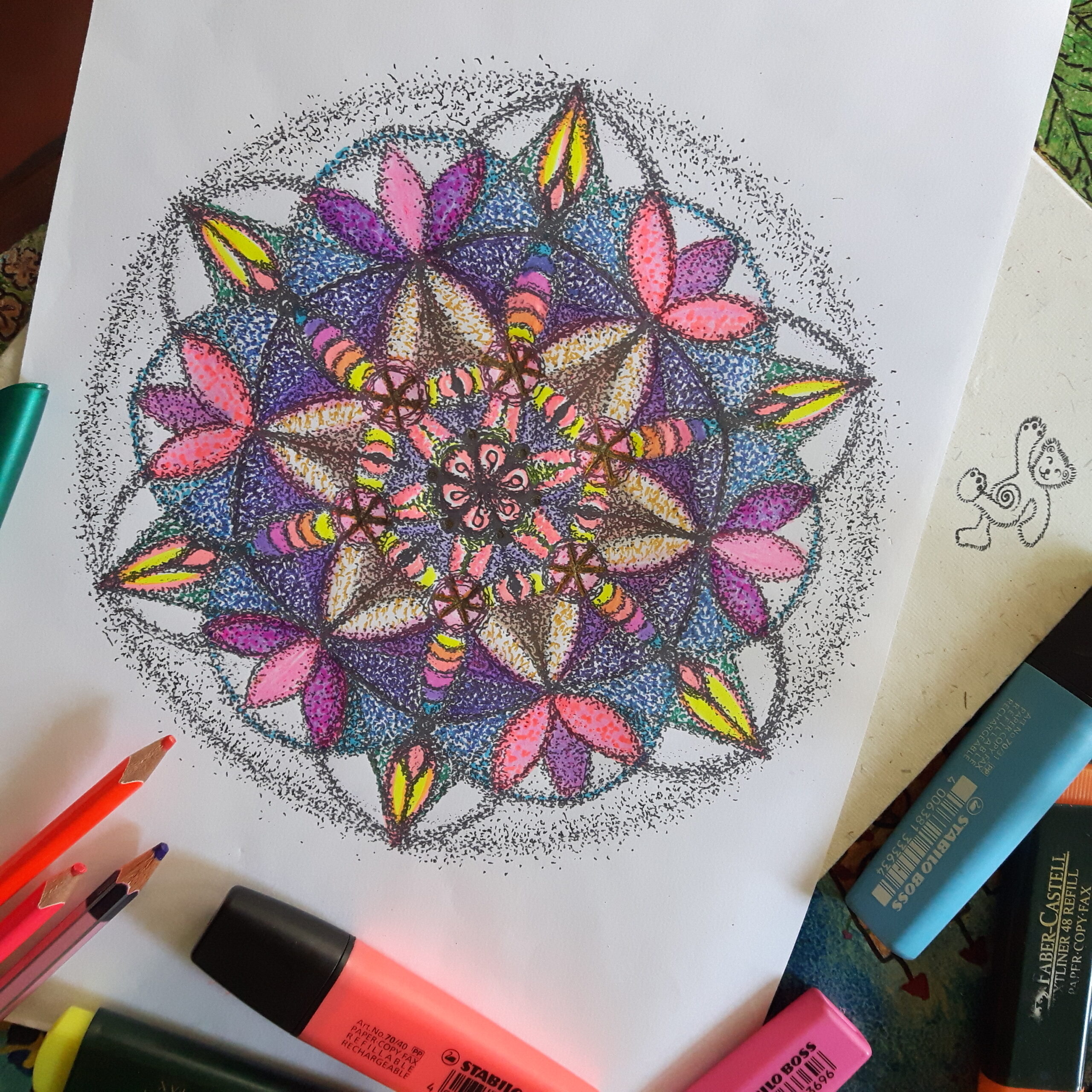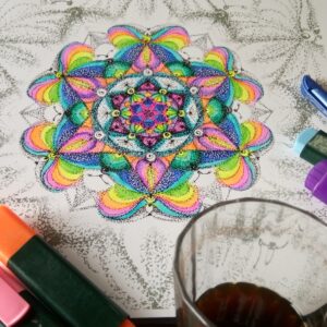 Coloring though was never my thing, I found it rather boring. It is not that i didn’t like to color, i just didn’t like the motives of the coloring pages that were available to me that time. Many years later (around 2010) i started to draw mandalas which led to a collection of black and white artworks, excellent templates for coloring pages. So i started to color my mandalas which opend a new door of fascination. It is as if every mandala gets a second life, another way or form to express itself. It is like creating a new artwork each time or rather a new version of an already existing artwork and i am not getting tired to color one mandala over and over again. After the rather long and intense period of focus that is needed during the drawing of the mandala, coloring is the most fun part of my mandala work.