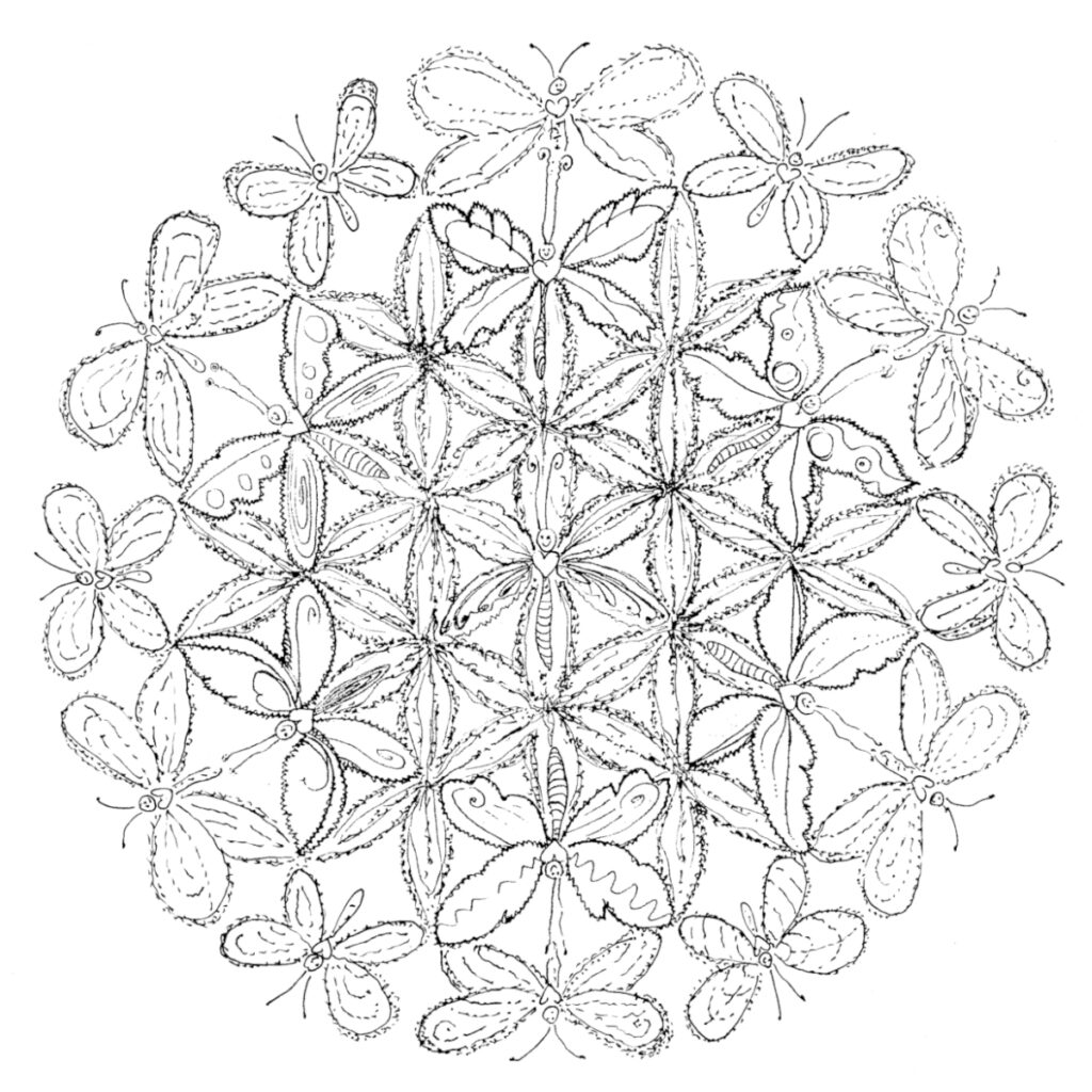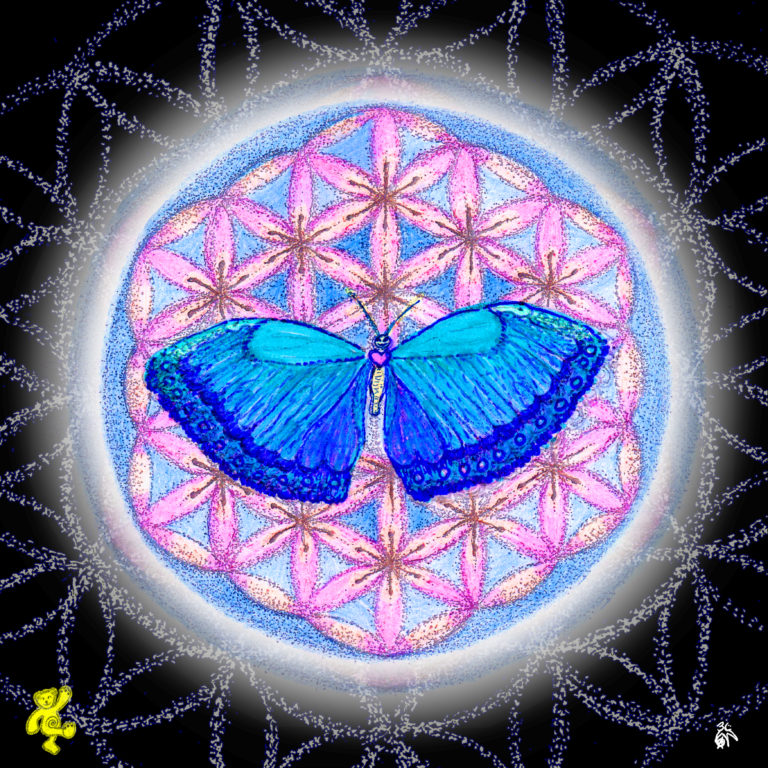 This mandala depicts a flower that attracts many butterflies. It is a special flower. It contains several small flowers arragend in a symmetrical and harmonic way like the “FLOWER of LIFE“. The so called life’s flower is not really a flower in the literal sense but a powerful ancient symbol found all over the world. It refers to Sacred Geometry and is seen as a symbol for the cycle of creation. It represents the basic forms of time and space and suggests that everything in this world is inter-connected. And when we start realizing that yeah, everything IS connected, we can start seeing the synchronicities and being in synchronicity. This great revelation leads to the profound experience of a sense of unity.