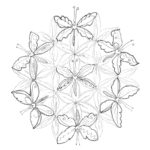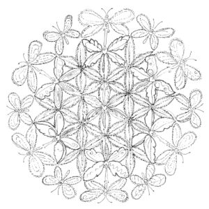 This mandala like drawing is depicting the Flower of Life Symbol together with a bunch of butterflies, a symbiosis of two energies that come together in tis mandala.